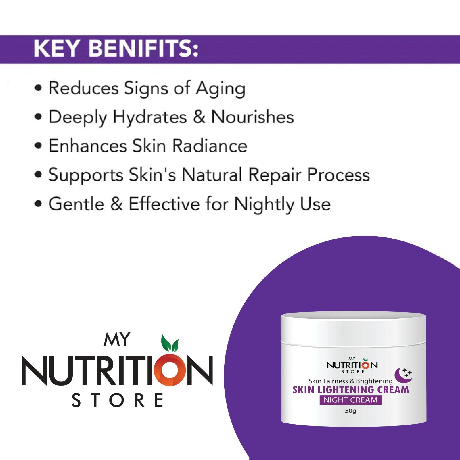 Skin Lightening Night Cream is a nutritive whitening cream that restores the facial skin before resting at night time. It contains Licorice extract, Alpha Arbutin & Shea Butter to continually whiten and clarify the skin as It rests, slowing down the production of melanin while smoothing and firming the skin.